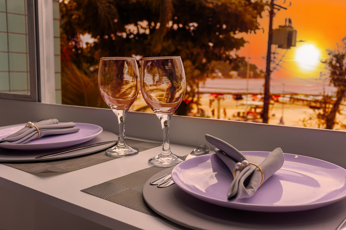 O grande destaque é a vista para o mar, especialmente no pôr do sol, que foi trabalhada na fotografia para trazer uma atmosfera mais convidativa e reforçar a experiência do ambiente.