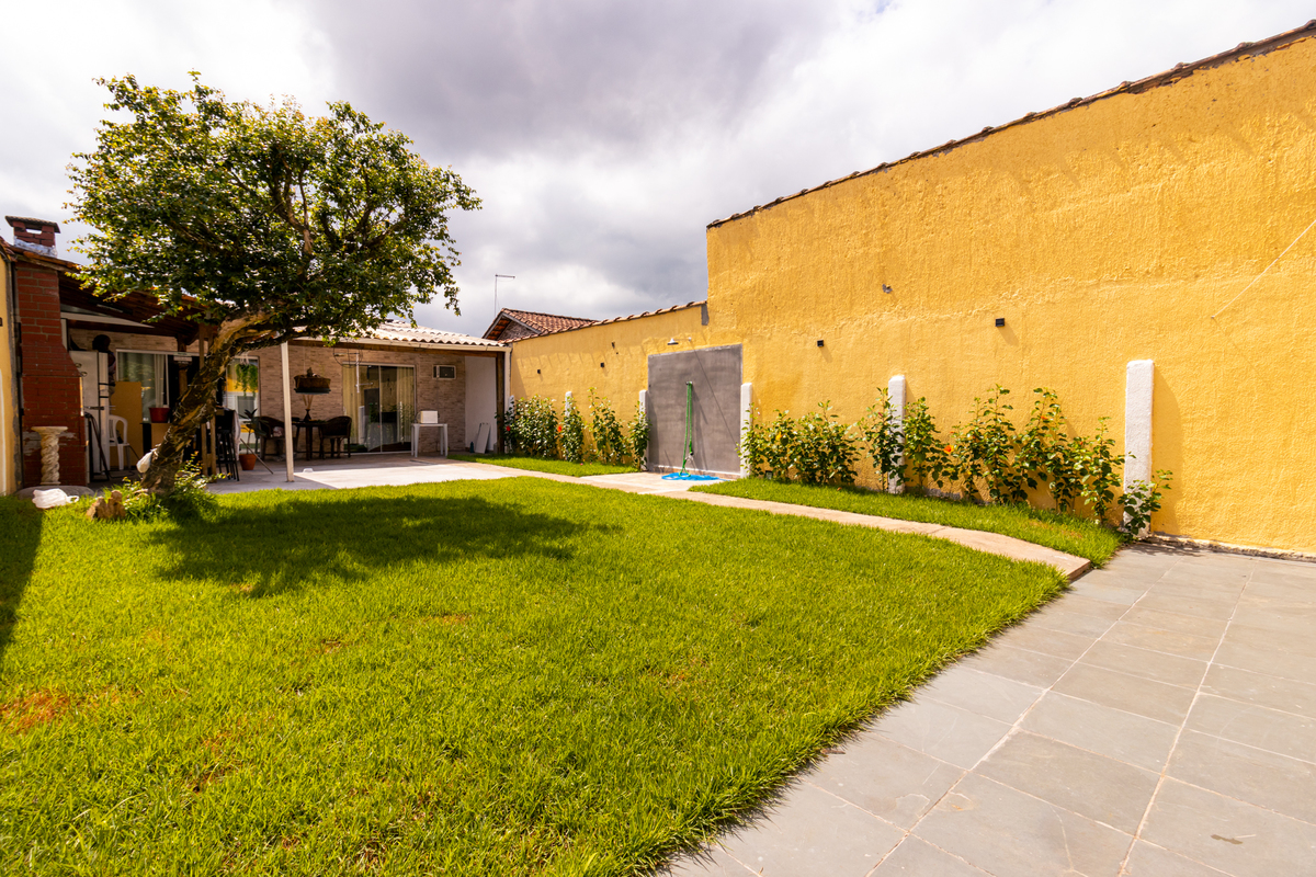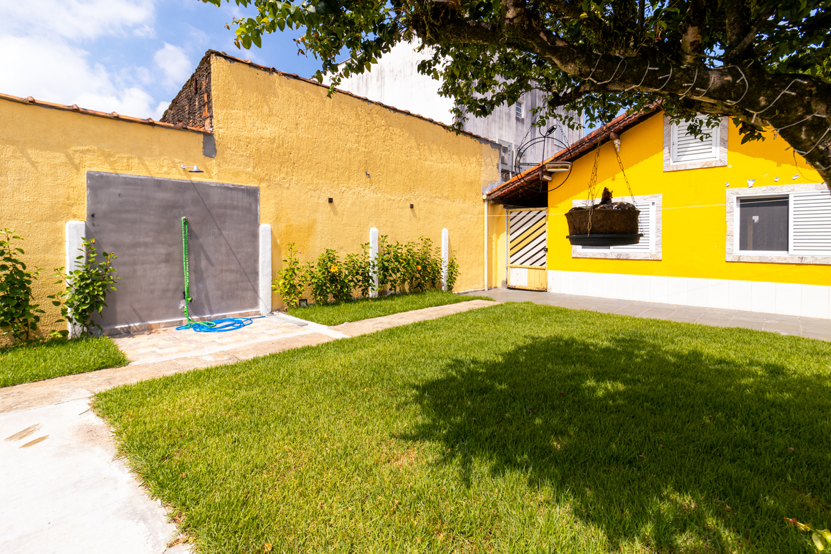 Casa na Rua Benedita Custódio, no bairro Samambaia, em Praia Grande – SP, com uma presença que chama atenção logo de cara: fachada amarela, quintal amplo e aquele clima de casa que convida a ficar.